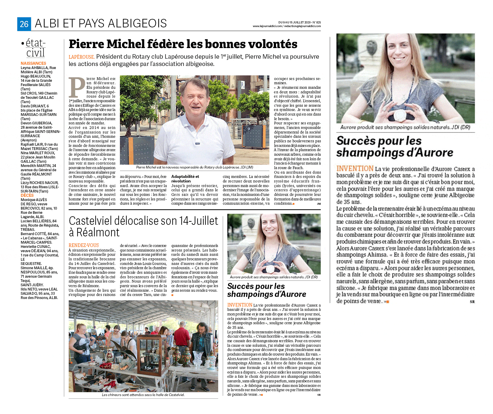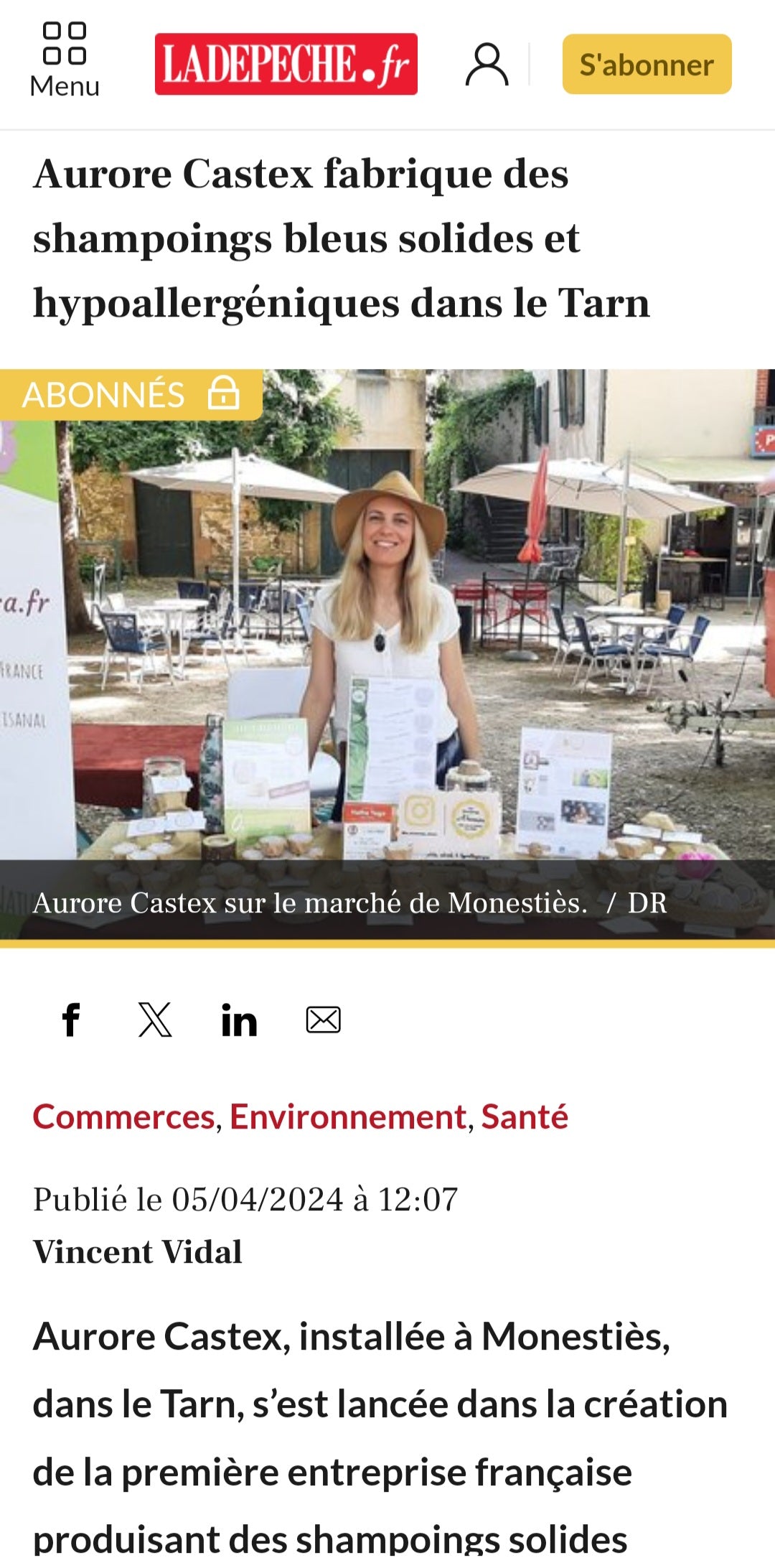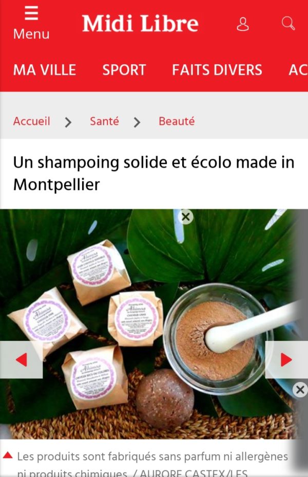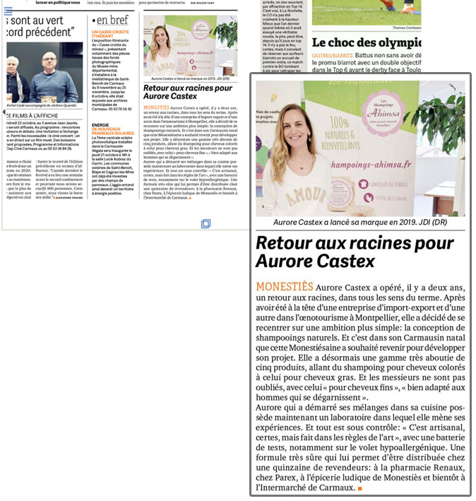 "(...) Alors Aurore Castex s'est lancée dans la fabrication de ses shampoings Ahimsa. Et à force de faire des essais, j'ai trouvé une formule qui a été très efficace puisque mon eczéma a disparu.» Alors pour aider les autres personnes, elle a fait le choix de produire ses shampoings solides naturels, sans allergène, sans parfum, sans paraben et sans silicone. "Je fabrique ma gamme dans mon laboratoire et je la vends sur ma boutique en ligne ou par l'intermédiaire de points de vente.»