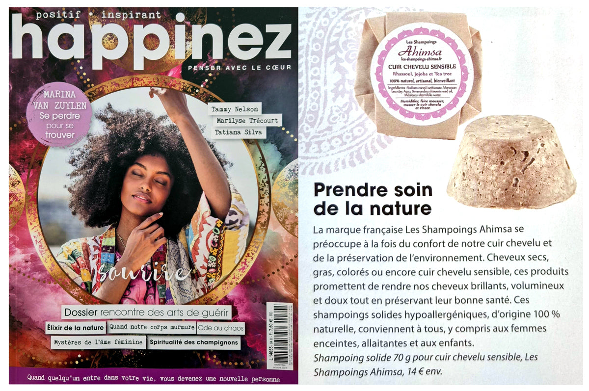 Les Shampoings Ahimsa séléctionnés par la rédaction du magazine Happinez