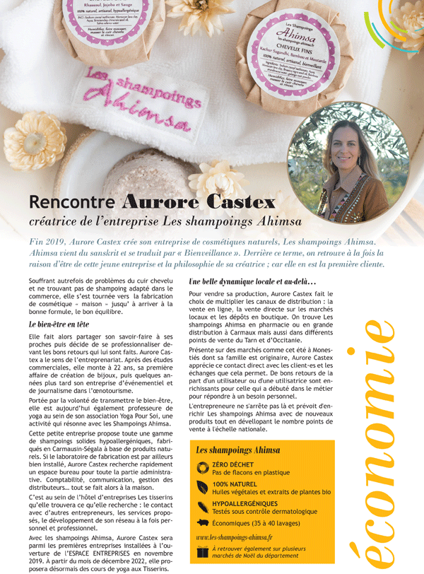 "(...) Elle a aussi créé la marque de cosmétiques naturels : Les Shampoings Ahimsa, première marque française de shampoings solides 100 % naturels et hypoallergéniques que l’on trouve au point d’accueil touristique, au marché hebdomadaire de l’été ou annuel de Noël (dimanche 3 décembre), chez les revendeurs partenaires et sur la boutique en lignewww.les-shampoings-ahimsa.fr."